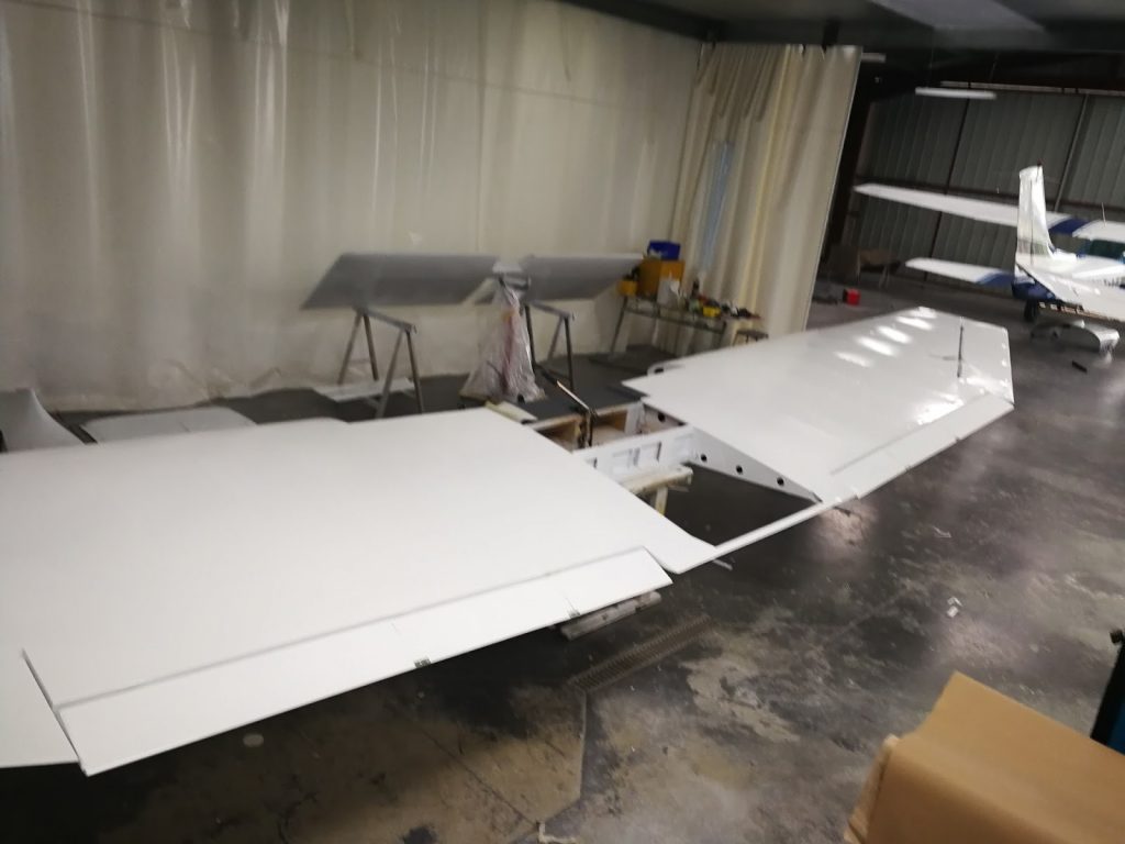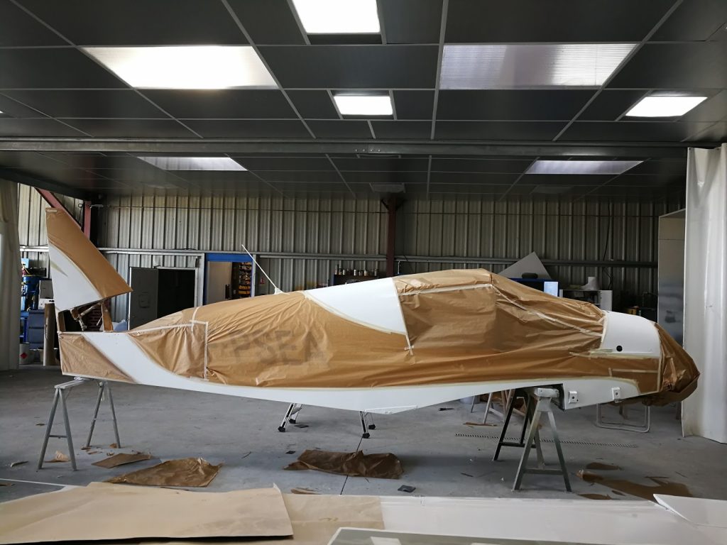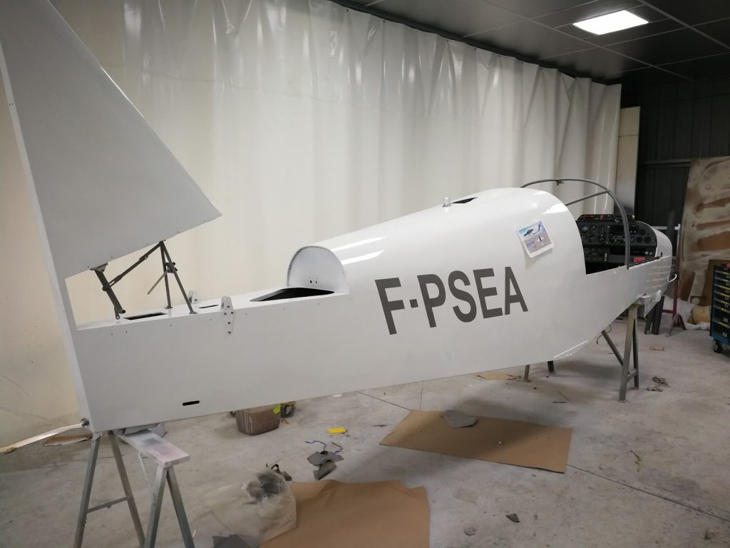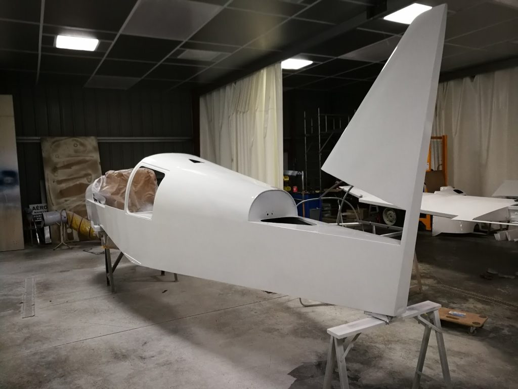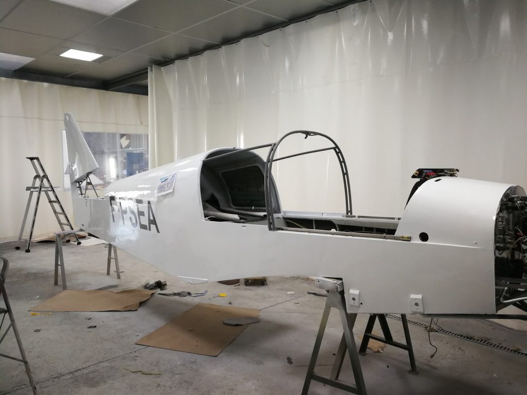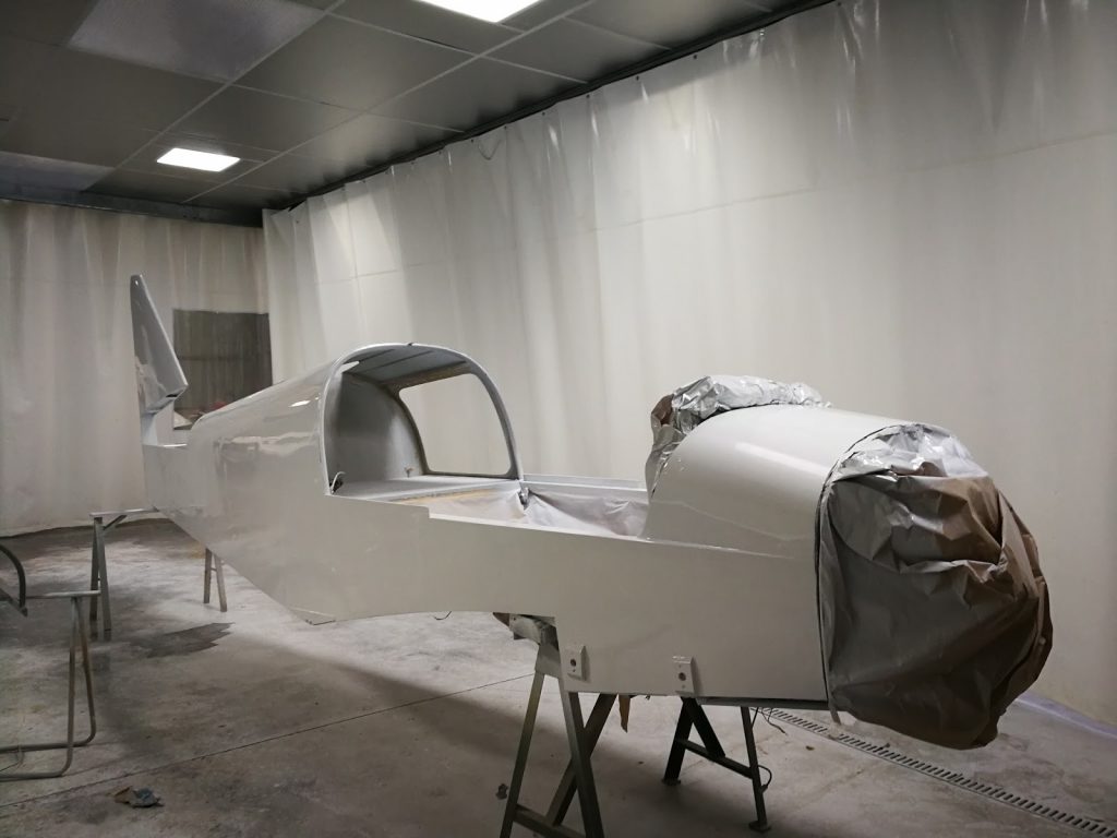 La cellule est entièrement entoilée, et les deux couches de blanc ont été déposées sur le fuselage.
