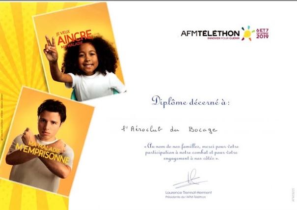 L’association du Téléthon à St André Sur Sèvre, nous remercie très chaleureusement pour notre participation. Plus de 8.400 euros ont été collectés… une performance pour un village de moins de 700 habitants. Les 3 vols de promenade offerts pour les 3 premiers lots ont rendu la tombola alléchante. Guy et son épouse nous représentaient à la remise des prix et ont été invités au dîner qui clôturaient la journée.